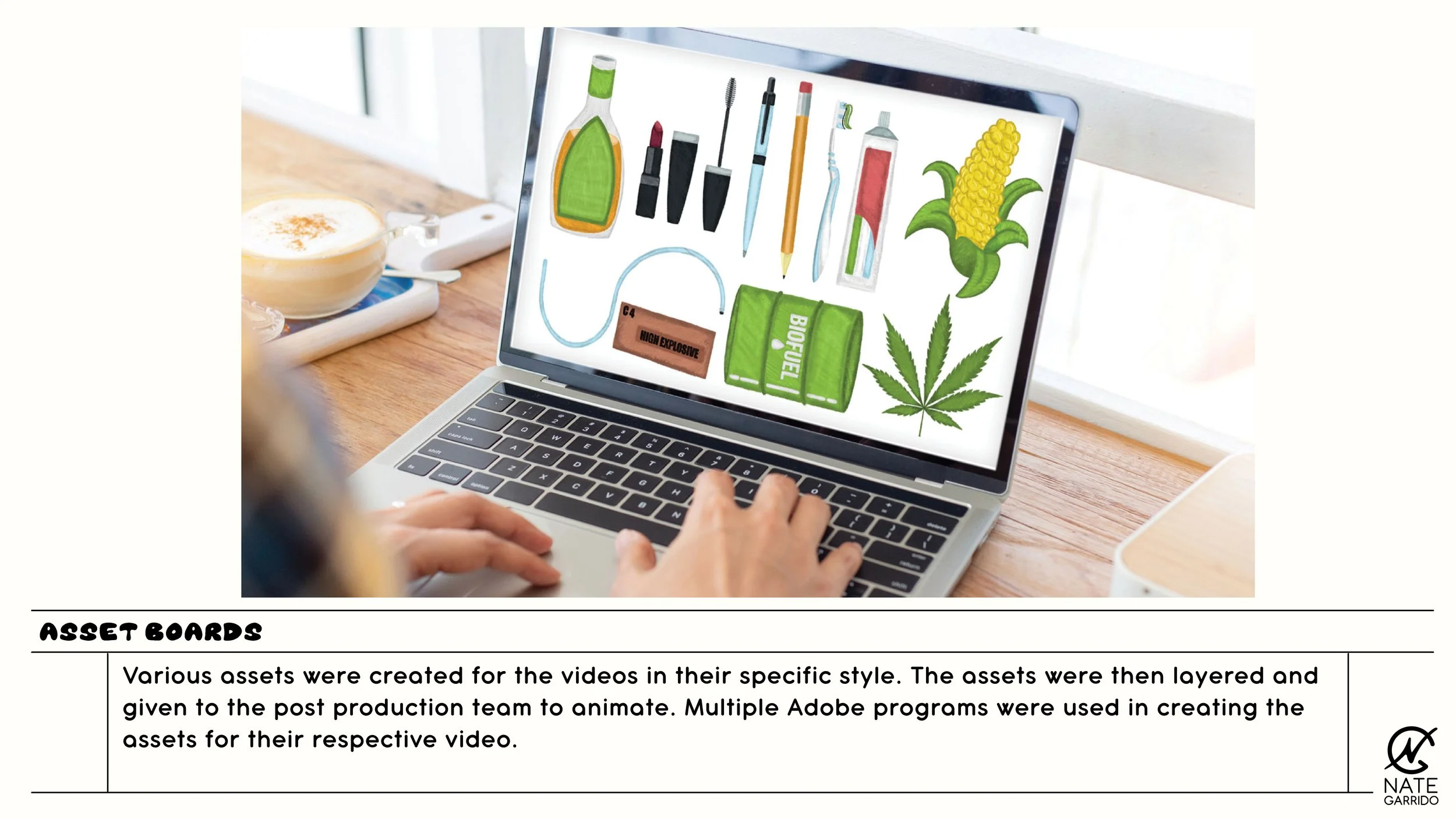 An asset board is a collection of highlighted elements gathered together to get an overall artistic sense and vibe of the project. Asset boards were created for the project as a way to ensure continuity throughout the project while acting as an ongoing checklist of items needed. Once approved, they were then disassembled and layered for animation.