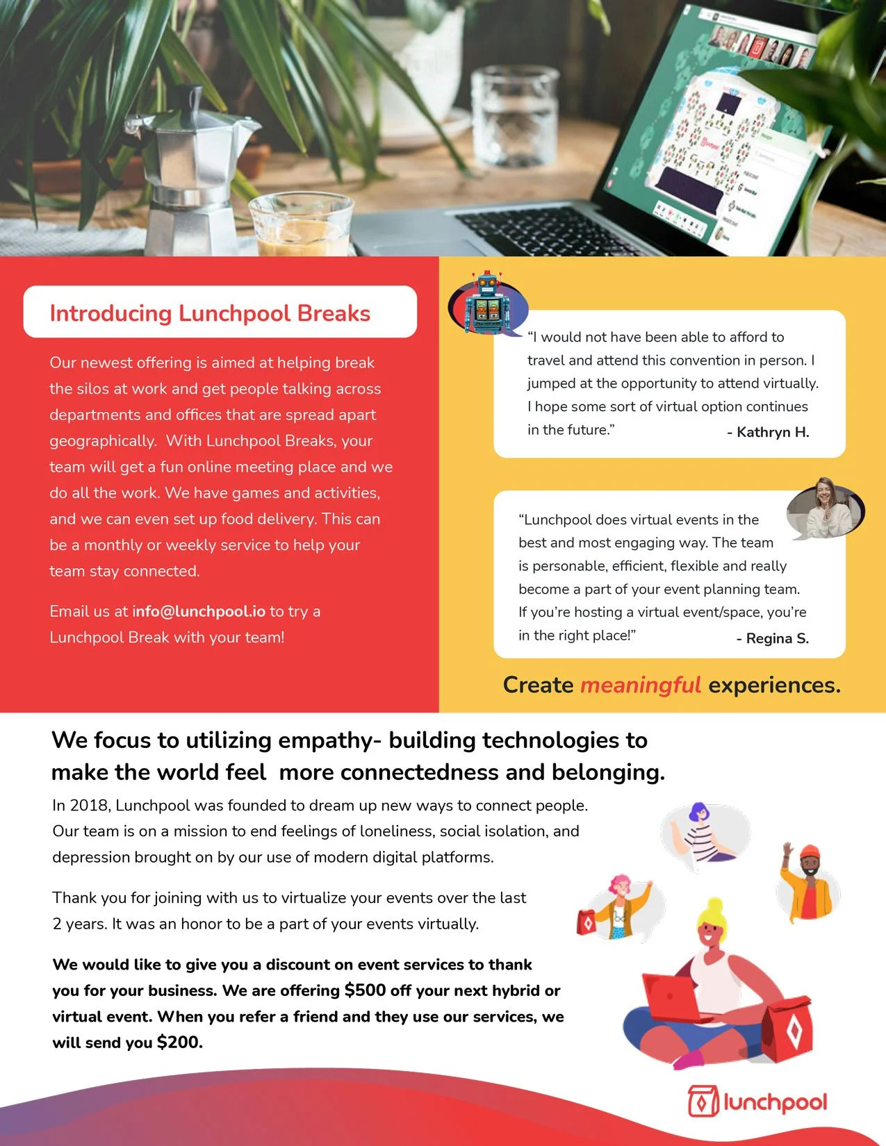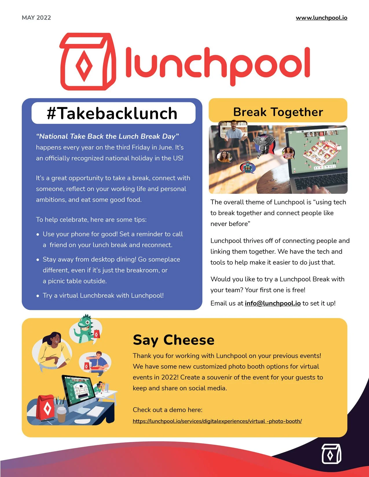 Lunchpool requested for me to assist with a rebranding of their company. This consisted of developing a design and style for the already established business. A few variations were created before finalizing the direction for imagery, typography, illustration, layout design, color, and more. Below is a collection of collateral created for Lunchpool.