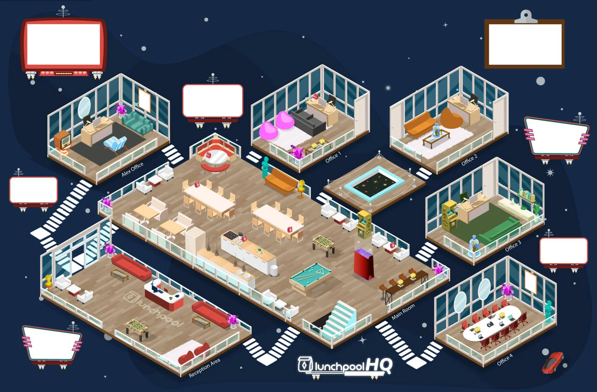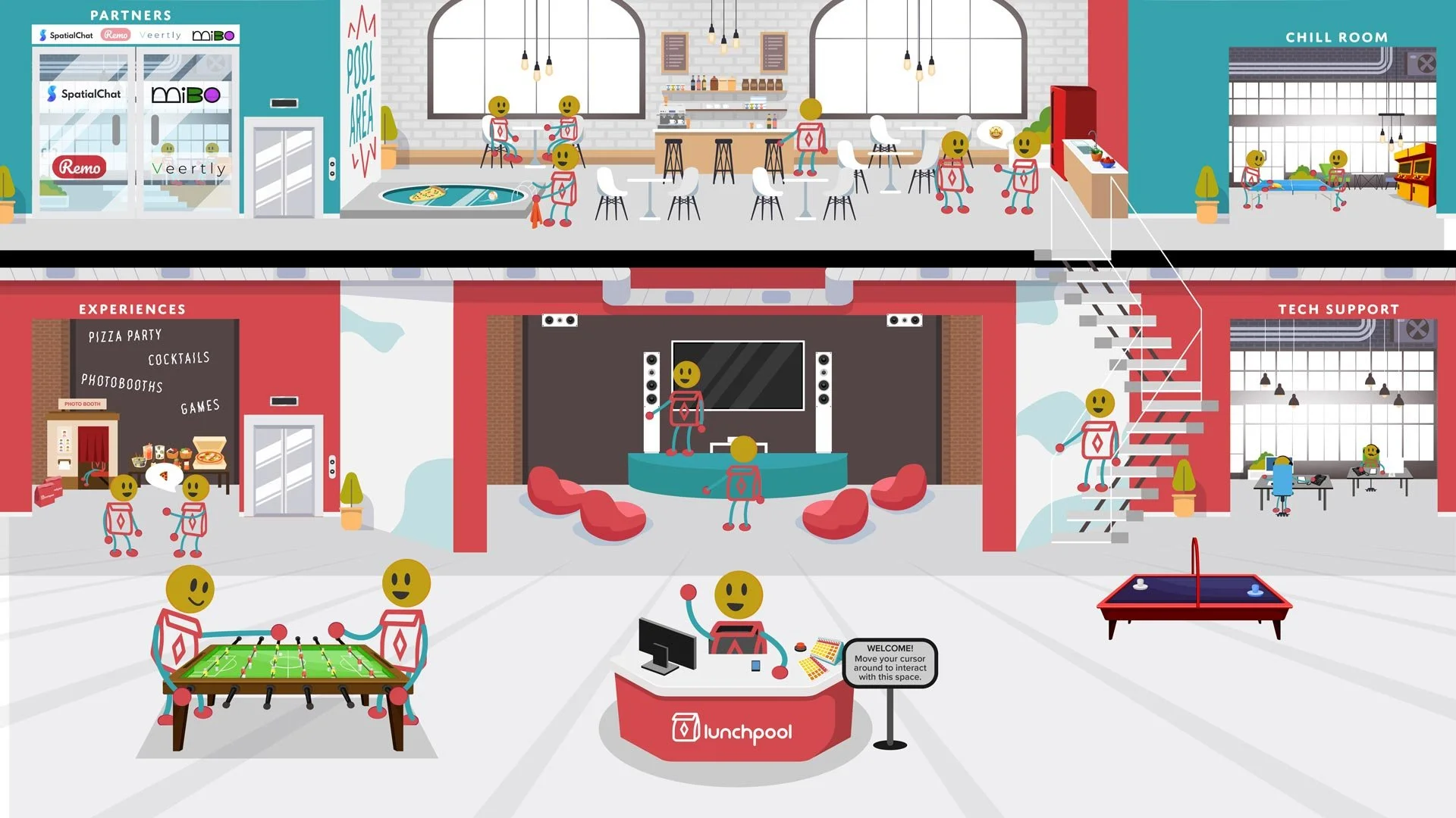 Remo is an online interactive events platform that authentically connects people. Lunchpool often used Remo as a platform for their virtual events. The Remo Maps required very specific file structure and layering within the 1MB max SVG files. Lunchpool provided the design requests specified by their clients and my objective was to achieve their desired aesthetic under the Remo Map restrictions. Some maps required recreations of existing spaces while others were open to interpretation.