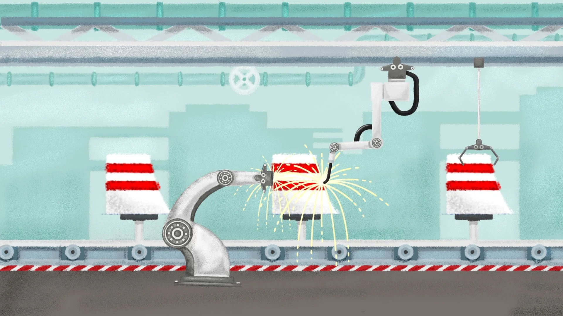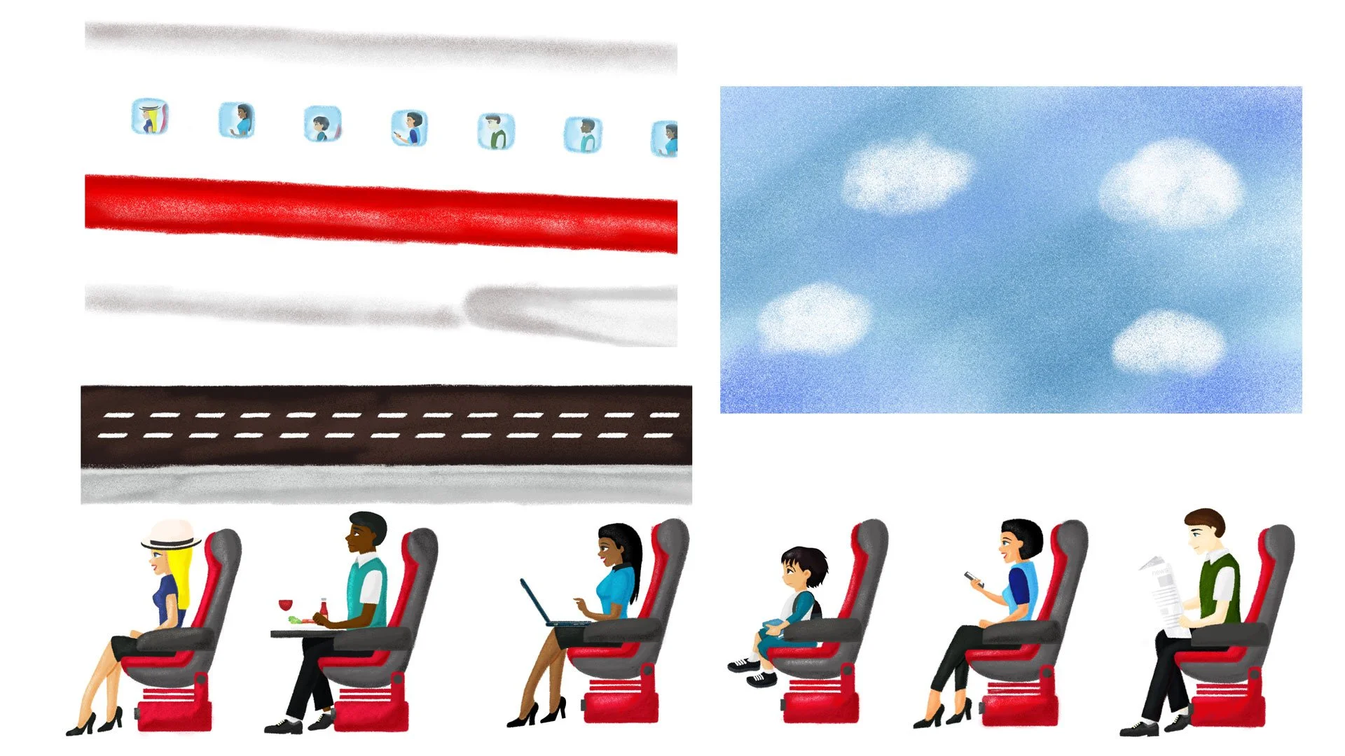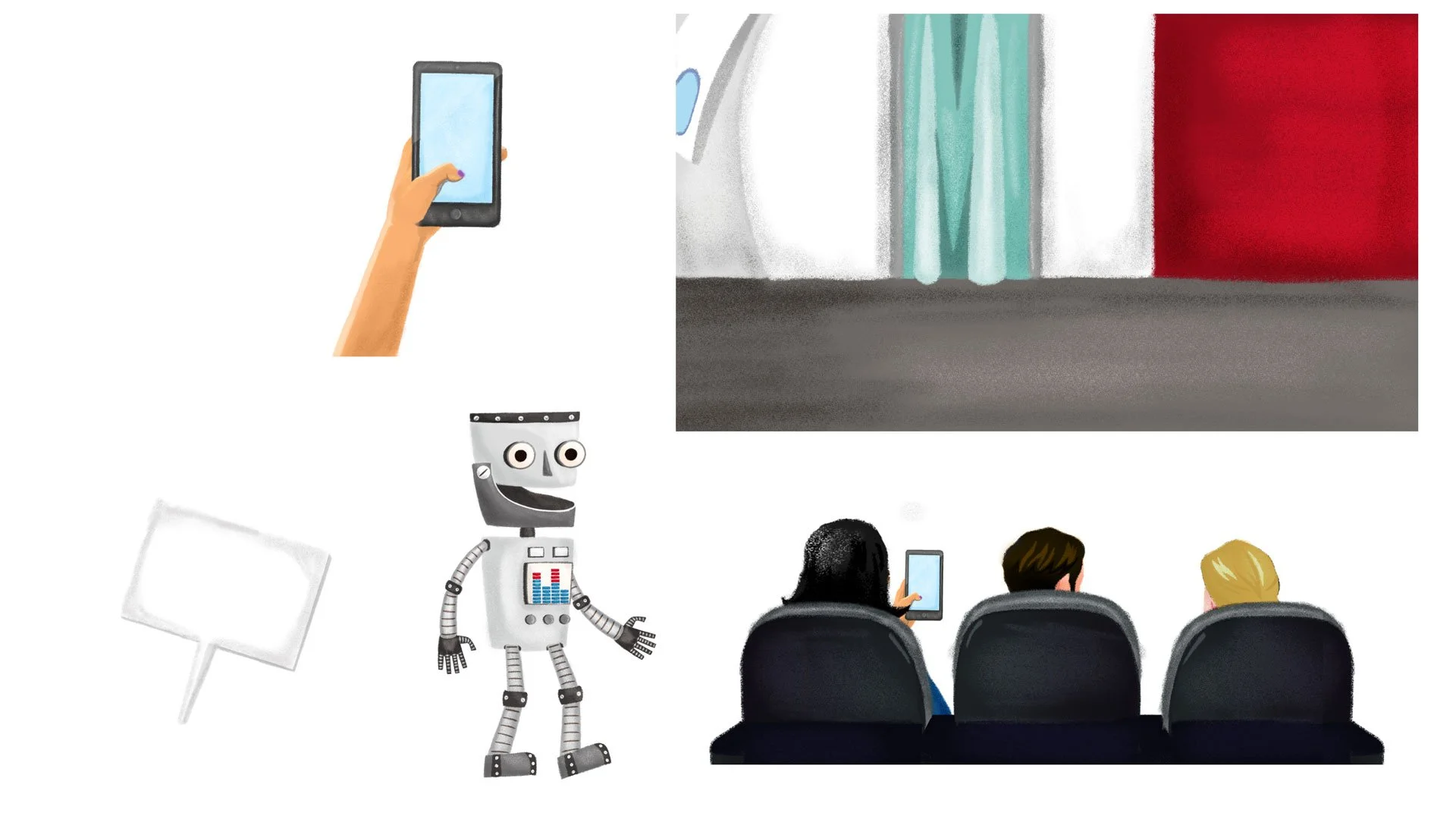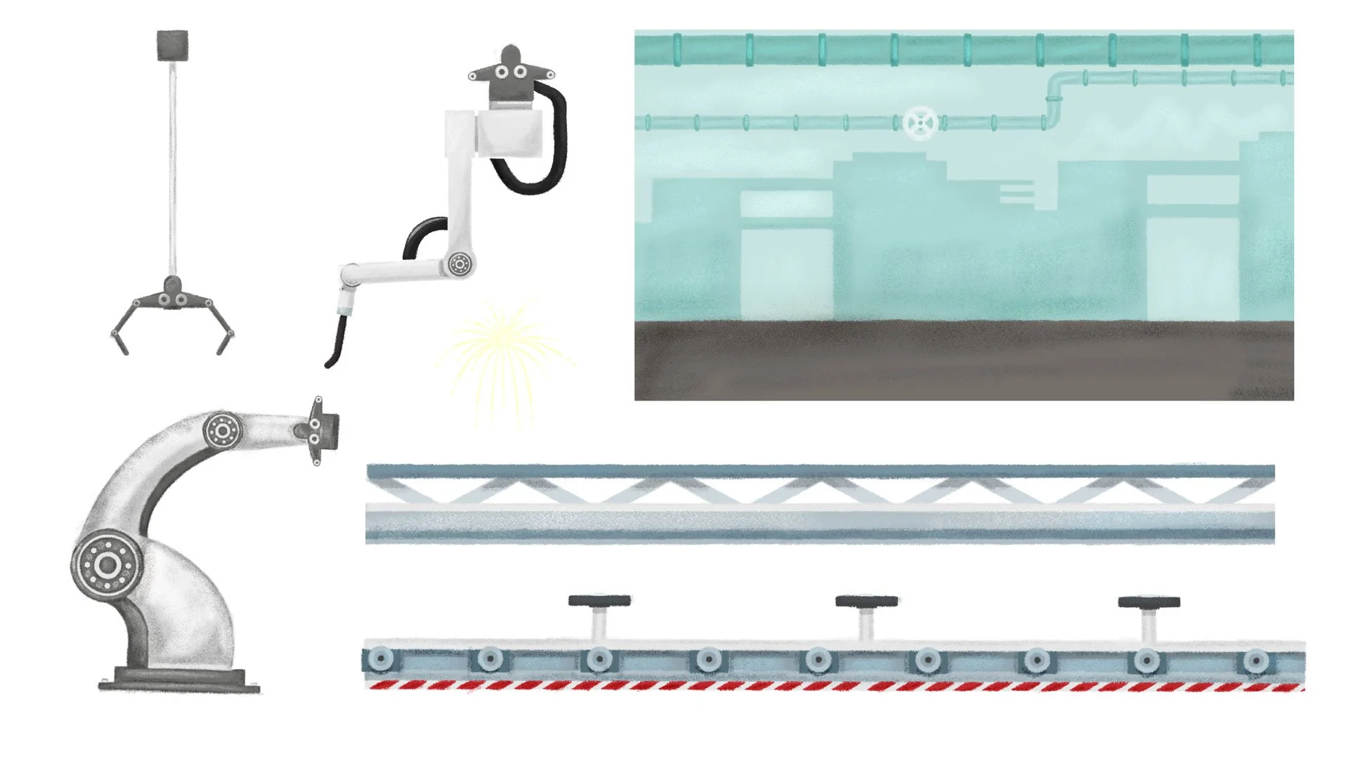 An asset board is a collection of highlighted elements gathered together to get an overall artistic sense and vibe of the project. Asset boards were created for the project as a way to ensure continuity throughout the project while acting as an ongoing checklist of items needed. Once approved, they were then disassembled and layered for animation.