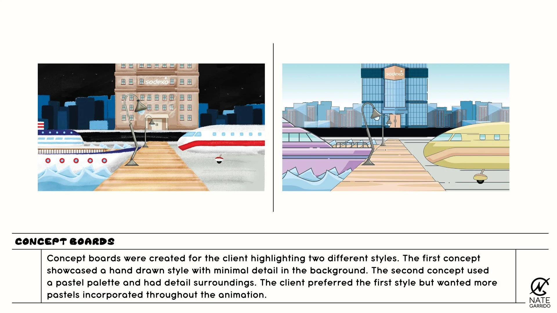 A concept board is a visual starting point of the creative process and is used to describe the artistic direction of a project. Two concepts were presented to the client prior to scripting & storyboarding. They were created to show aborad direction and approach to the story being told.