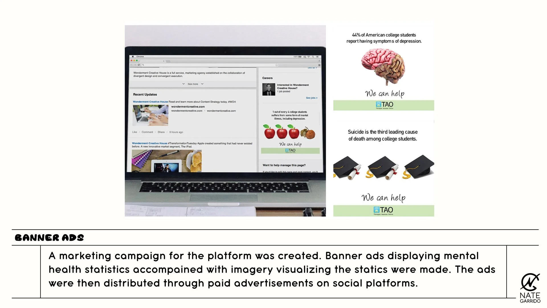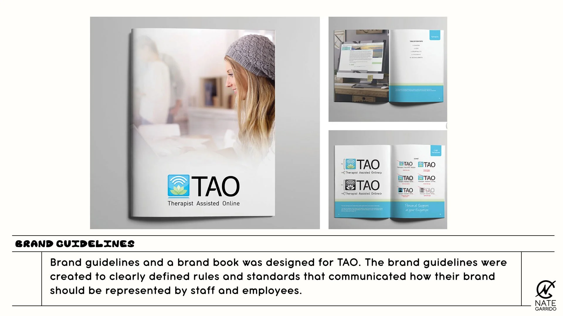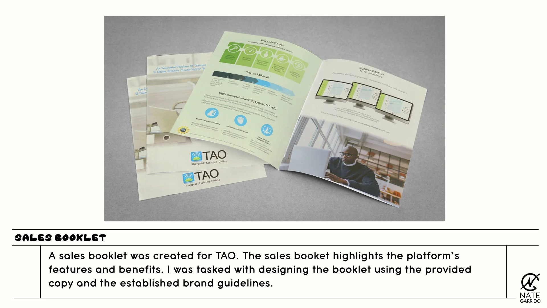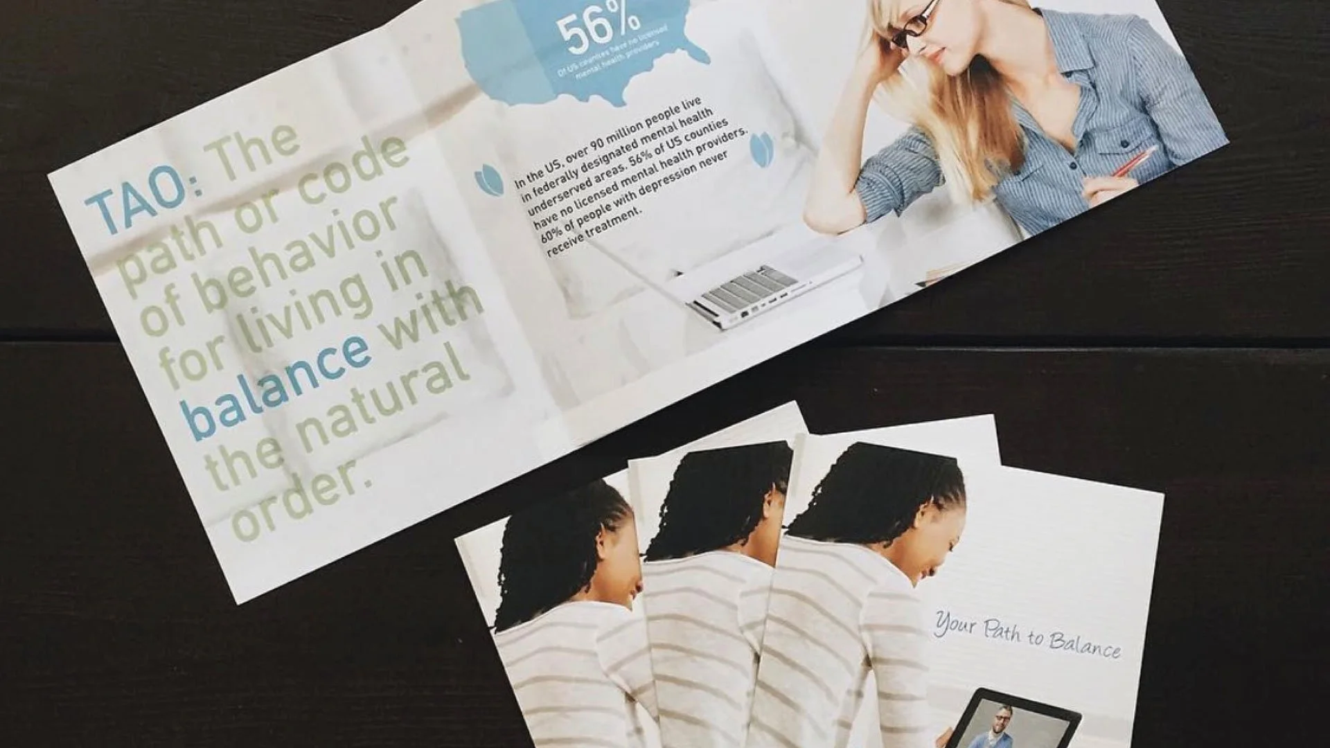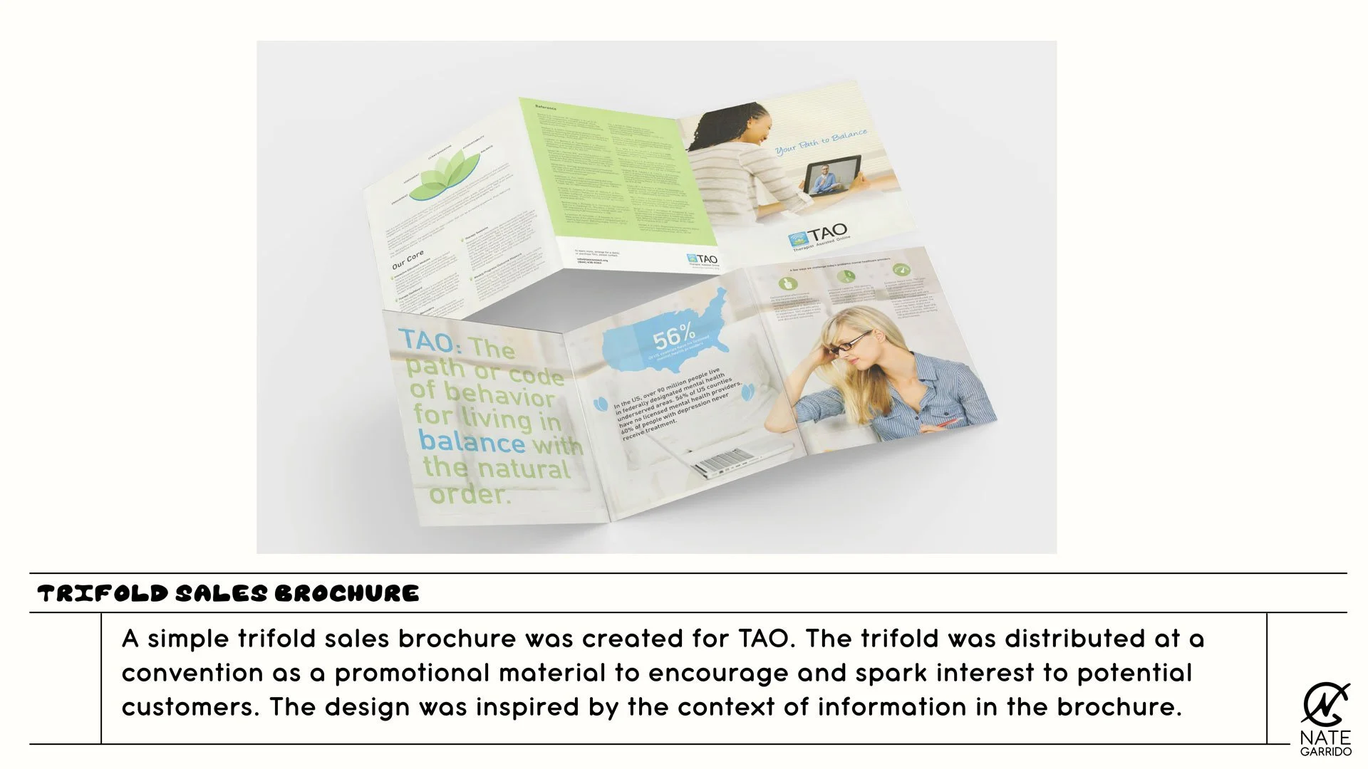 TAO is an accessible therapy platform designed to provide online and mobile tools to help individuals conquer day-to-day struggles. While working for Wonderment I was tasked with creating and establishing an overall brand for the client. I was also tasked with designing print materials, templates, sales materials, and more.